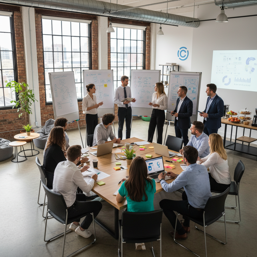 Ilustracja: Zespół kreatywny analizujący strategię outsourcingu kampanii w nowoczesnym biurze.